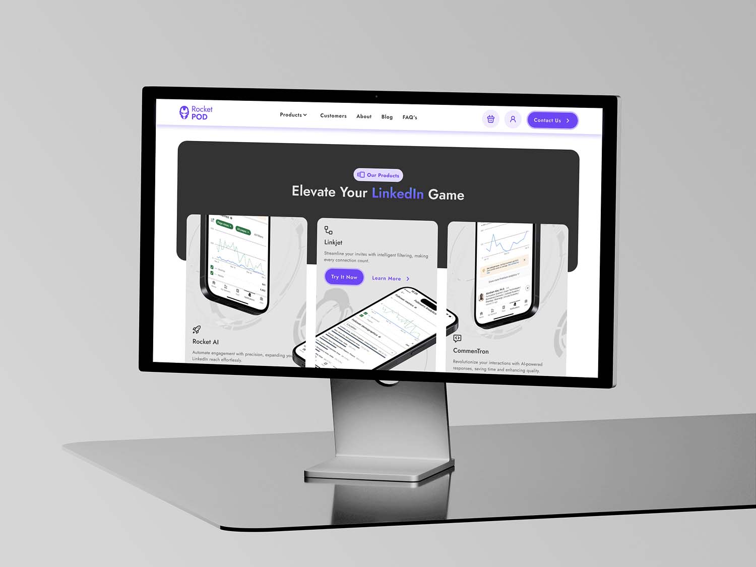 RocketPod came to us looking to unify their growing suite of tools (RocketAi, Commentron and Linkjet) into a single, cohesive web experience. I led the UX and UI design at Making Websites Better, working closely with the founders and development team. Alongside shaping the website structure and user journeys, I was also responsible for the visual direction and animated assets used to showcase each product’s features across the site.